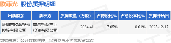 证券之星消息,欧菲光(002456)12月19日公开信息显示,股东深圳市欧菲投资控股有限公司向南昌招商产业投资有限公司合计质押2064.41万股,占总股本0.61%。质押详情见下表: