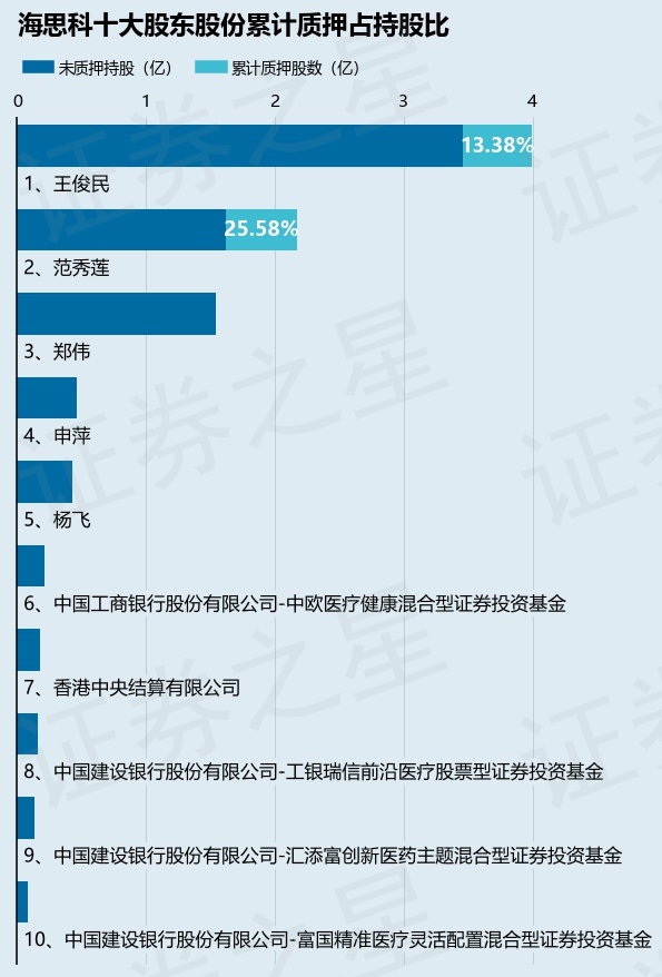 截止本公告日,股东王俊民已累计质押股份5344.0万股,占其持股总数的13.38%,股东范秀莲已累计质押股份5559.0万股,占其持股总数的25.58%。本次质押后海思科十大股东的累计质押股份占持股比例(占持股比例的计算以公司最新一期财务报表公布的十大股东的持股总数为基准)见下图: