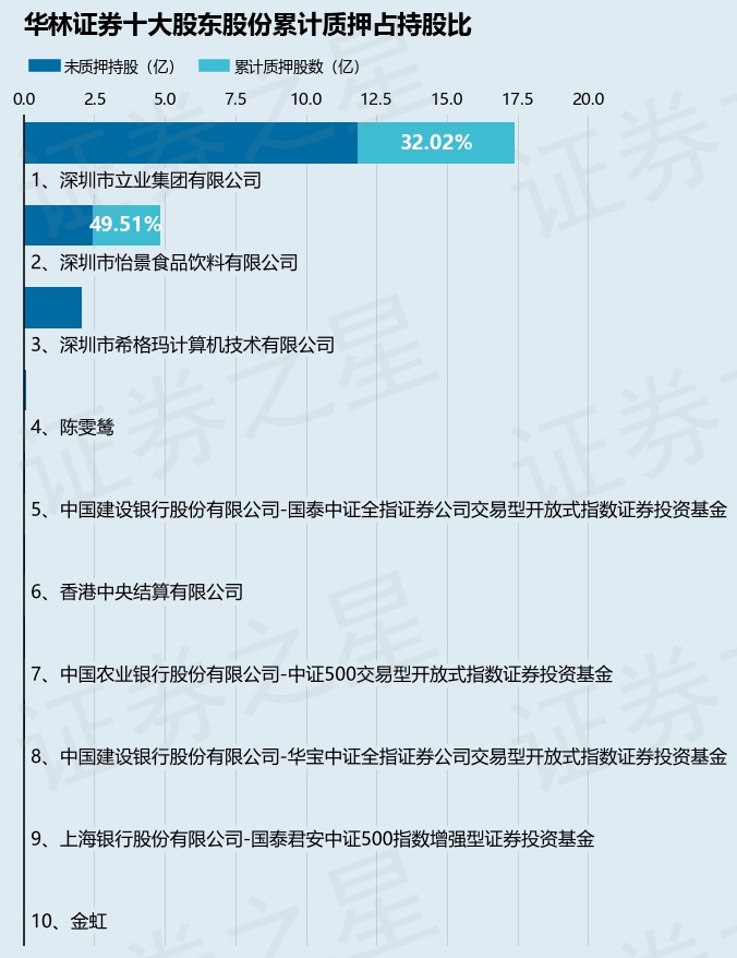 截止本公告日,股东深圳市立业集团有限公司已累计质押股份5.57亿股,占其持股总数的32.02%,股东深圳市怡景食品饮料有限公司已累计质押股份2.4亿股,占其持股总数的49.51%。本次质押后华林证券十大股东的累计质押股份占持股比例(占持股比例的计算以公司最新一期财务报表公布的十大股东的持股总数为基准)见下图: