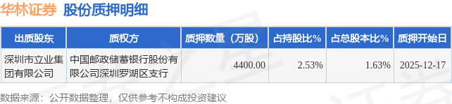 证券之星消息,华林证券(002945)12月19日公开信息显示,股东深圳市立业集团有限公司向中国邮政储蓄银行股份有限公司深圳罗湖区支行合计质押4400.0万股,占总股本1.63%。质押详情见下表: