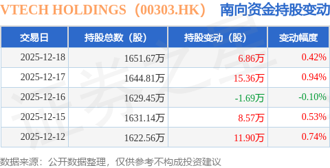 证券之星消息,12月18日南向资金增持6.86万股VTECH HOLDINGS(00303.HK)。近5个交易日中,获南向资金增持的有4天,累计净增持41.0万股。近20个交易日中,获南向资金增持的有16天,累计净增持270.43万股。截至目前,南向资金持有VTECH HOLDINGS(00303.HK)1651.67万股,占公司已发行普通股的6.51%。