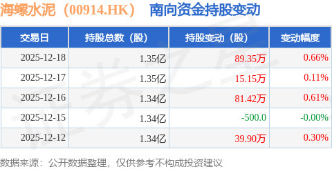 证券之星消息,12月18日南向资金增持89.35万股海螺水泥(00914.HK)。近5个交易日中,获南向资金增持的有4天,累计净增持225.77万股。近20个交易日中,获南向资金增持的有10天,累计净增持456.27万股。截至目前,南向资金持有海螺水泥(00914.HK)1.35亿股,占公司已发行普通股的10.42%。