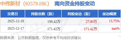 证券之星消息,12月18日南向资金增持27.0万股中伟新材(02579.HK)。截至目前,南向资金持有中伟新材(02579.HK)198.42万股,占公司已发行普通股的1.89%。