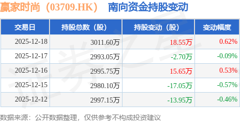 证券之星消息,12月18日南向资金增持18.55万股赢家时尚(03709.HK)。近5个交易日中,获南向资金增持的有2天,累计净增持5000.0股。近20个交易日中,获南向资金减持的有12天,累计净减持130.9万股。截至目前,南向资金持有赢家时尚(03709.HK)3011.6万股,占公司已发行普通股的4.24%。