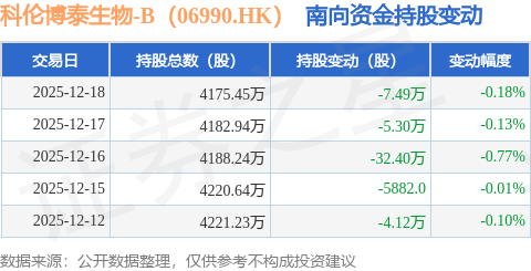 证券之星消息,12月18日南向资金减持7.49万股科伦博泰生物-B(06990.HK)。近5个交易日中,获南向资金减持的有5天,累计净减持49.89万股。近20个交易日中,获南向资金减持的有13天,累计净减持66.49万股。截至目前,南向资金持有科伦博泰生物-B(06990.HK)4175.45万股,占公司已发行普通股的25.65%。