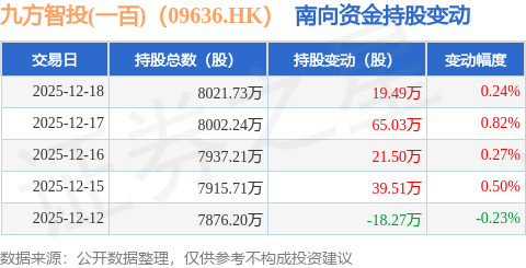 证券之星消息,12月18日南向资金增持19.49万股九方智投(一百)(09636.HK)。近5个交易日中,获南向资金增持的有4天,累计净增持127.26万股。近20个交易日中,获南向资金减持的有10天,累计净减持145.86万股。截至目前,南向资金持有九方智投(一百)(09636.HK)8021.73万股,占公司已发行普通股的17.12%。