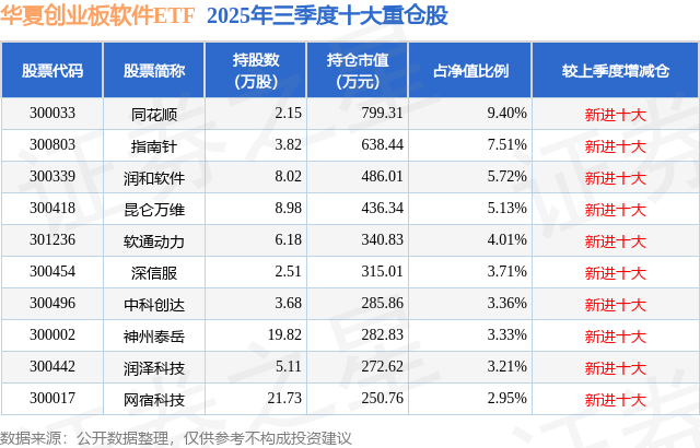 华夏创业板软件ETF基金成立于2025年7月24日,基金经理为单宽之,基金跟踪标的为创业板软件指数,成立以来超额回报为-2.59%,近一个月超额回报为-0.8%。最新披露的基金持仓数据显示,截止2025年9月30日,该基金第一大重仓股为同花顺(300033),持股占比为9.4%。