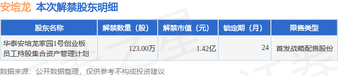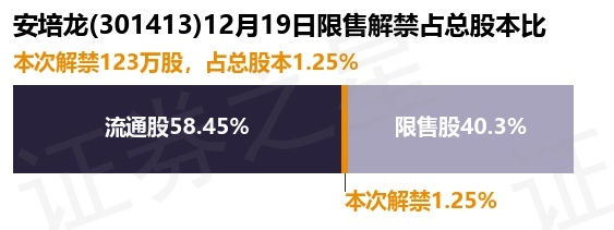 证券之星消息,根据市场公开信息整理,安培龙(301413)于12月19日将有123.0万股限售股份解禁,为公司首发战略配售股份,占公司总股本1.25%。(本次数据根据历史公告整理得出,实际情况以上市公司最新公告为准)最近一年内,该股累计解禁3537.94万股,占总股本的35.95%。本次解禁后,公司还有3965.21万股限售股份,占总股本40.3%。具体如下图所示: