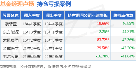 卢扬管理的申万菱信新经济混合A基金在18年1季度买入索菲亚,在持有3个季度后在18年4季度卖出。持有期间的估算收益率为-46.89%,持有期间索菲亚在2017年到2018年的年报营业总收入增幅达18.66%。