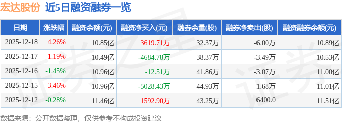 宏达股份融资融券信息显示,融资方面,当日融资买入1.47亿元,融资偿还1.11亿元,融资净买入3619.71万元。融券方面,融券卖出3900.0股,融券偿还6.39万股,融券余量32.37万股,融券余额372.58万元。融资融券余额10.89亿元。