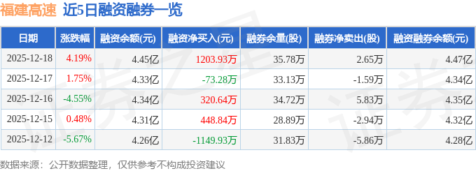 福建高速融资融券信息显示,融资方面,当日融资买入8052.65万元,融资偿还6848.73万元,融资净买入1203.93万元。融券方面,融券卖出7.94万股,融券偿还5.29万股,融券余量35.78万股,融券余额151.35万元。融资融券余额4.47亿元。