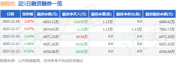 倍轻松融资融券信息显示,融资方面,当日融资买入174.12万元,融资偿还289.03万元,融资净偿还114.91万元。融券方面,融券卖出0.0股,融券偿还0.0股,融券余量1.13万股,融券余额29.67万元。融资融券余额6888.82万元。