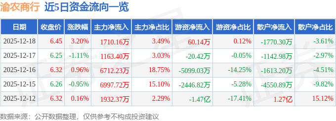 证券之星消息,截至2025年12月18日收盘,渝农商行(601077)报收于6.45元,上涨3.2%,换手率0.87%,成交量76.95万手,成交额4.9亿元。