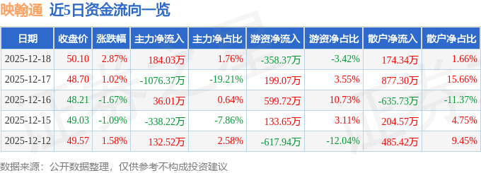 12月18日的资金流向数据方面,主力资金净流入184.03万元,占总成交额1.76%,游资资金净流出358.37万元,占总成交额3.42%,散户资金净流入174.34万元,占总成交额1.66%。