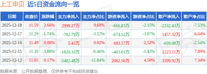 证券之星消息,截至2025年12月18日收盘,上工申贝(600843)报收于11.59元,上涨2.66%,换手率5.73%,成交量26.89万手,成交额3.1亿元。