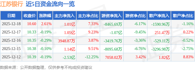 证券之星消息,截至2025年12月18日收盘,江苏银行(600919)报收于10.6元,上涨2.61%,换手率0.71%,成交量130.87万手,成交额13.71亿元。