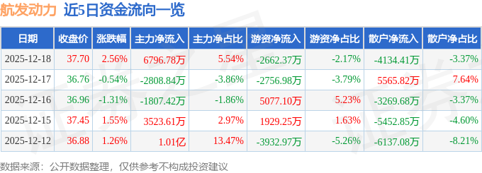 证券之星消息,截至2025年12月18日收盘,航发动力(600893)报收于37.7元,上涨2.56%,换手率1.23%,成交量32.86万手,成交额12.27亿元。