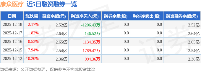 康众医疗融资融券信息显示,融资方面,当日融资买入3367.81万元,融资偿还4574.24万元,融资净偿还1206.43万元。融券方面,融券卖出0.0股,融券偿还0.0股,融券余量0.0股,融券余额0.0万元。融资融券余额2.52亿元。