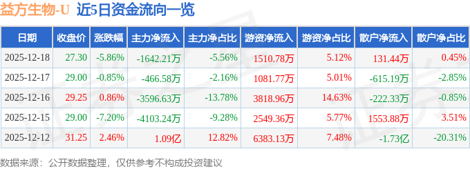 证券之星消息,截至2025年12月18日收盘,益方生物(688382)报收于27.3元,下跌5.86%,换手率2.52%,成交量10.52万手,成交额2.95亿元。
