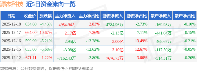 证券之星消息,截至2025年12月18日收盘,源杰科技(688498)报收于634.6元,下跌4.43%,换手率4.56%,成交量2.74万手,成交额17.51亿元。