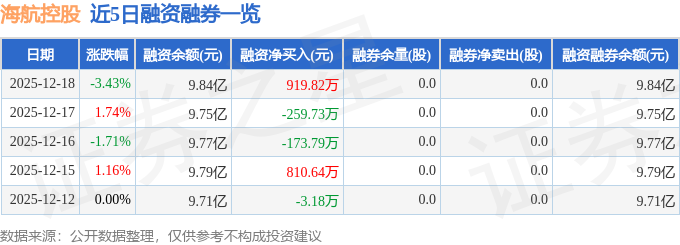 海航控股融资融券信息显示,融资方面,当日融资买入7652.86万元,融资偿还6733.03万元,融资净买入919.82万元。融券方面,融券卖出0.0股,融券偿还0.0股,融券余量0.0股,融券余额0.0万元。融资融券余额9.84亿元。