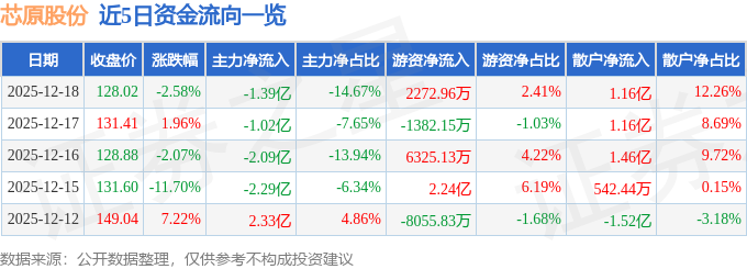 12月18日的资金流向数据方面,主力资金净流出1.39亿元,占总成交额14.67%,游资资金净流入2272.96万元,占总成交额2.41%,散户资金净流入1.16亿元,占总成交额12.26%。