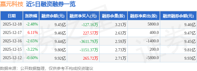 嘉元科技融资融券信息显示,融资方面,当日融资买入2397.52万元,融资偿还2524.67万元,融资净偿还127.16万元。融券方面,融券卖出6000.0股,融券偿还200.0股,融券余量3.21万股,融券余额113.37万元。融资融券余额9.46亿元。