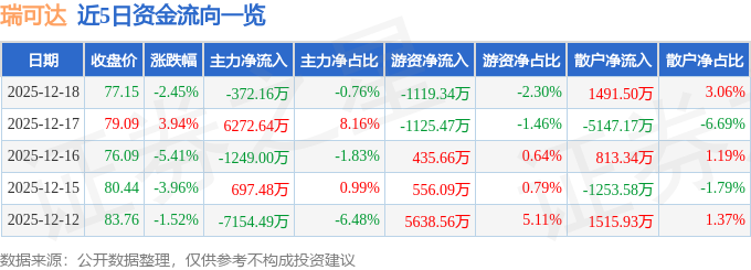 证券之星消息,截至2025年12月18日收盘,瑞可达(688800)报收于77.15元,下跌2.45%,换手率3.05%,成交量6.28万手,成交额4.87亿元。