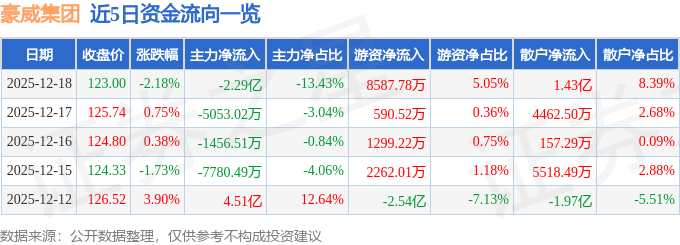 12月18日的资金流向数据方面,主力资金净流出2.29亿元,占总成交额13.43%,游资资金净流入8587.78万元,占总成交额5.05%,散户资金净流入1.43亿元,占总成交额8.39%。