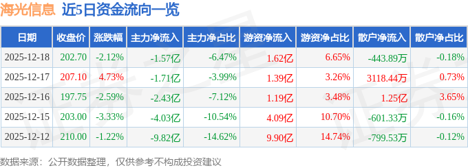 证券之星消息,截至2025年12月18日收盘,海光信息(688041)报收于202.7元,下跌2.12%,换手率0.51%,成交量11.93万手,成交额24.3亿元。