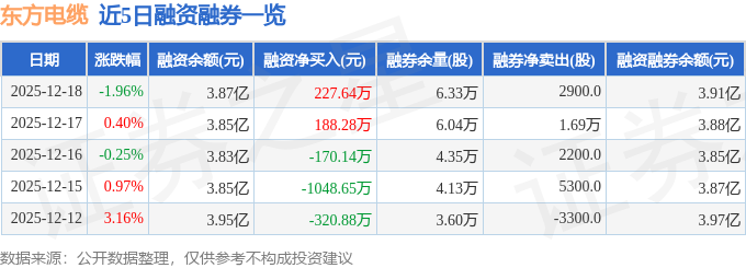 证券之星消息,截至2025年12月18日收盘,东方电缆(603606)报收于59.58元,下跌1.96%,换手率0.59%,成交量4.04万手,成交额2.41亿元。