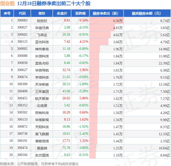 创业板融券净卖出前三分别为:创世纪(300083)融券净卖出6.5万股、华谊兄弟(300027)融券净卖出4.83万股、飞荣达(300602)融券净卖出4.02万股,前20具体见下表: