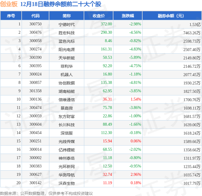 创业板融券余额前三分别为:宁德时代(300750)融券余额1.53亿元、胜宏科技(300476)融券余额7463.26万元、蓝色光标(300058)融券余额2598.73万元,前20具体见下表: