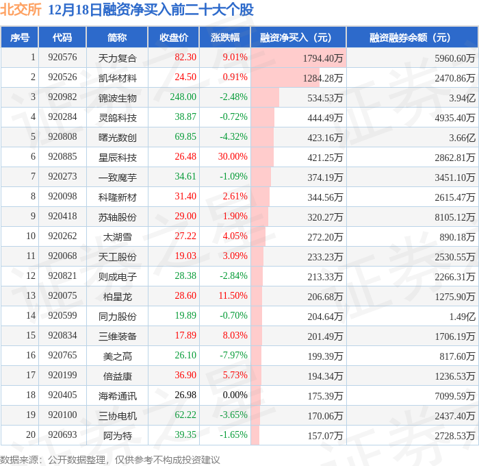 北交所融资净买入前三分别为:天力复合(920576)融资净买入1794.4万元、凯华材料(920526)融资净买入1284.28万元、锦波生物(920982)融资净买入534.53万元,前20具体见下表: