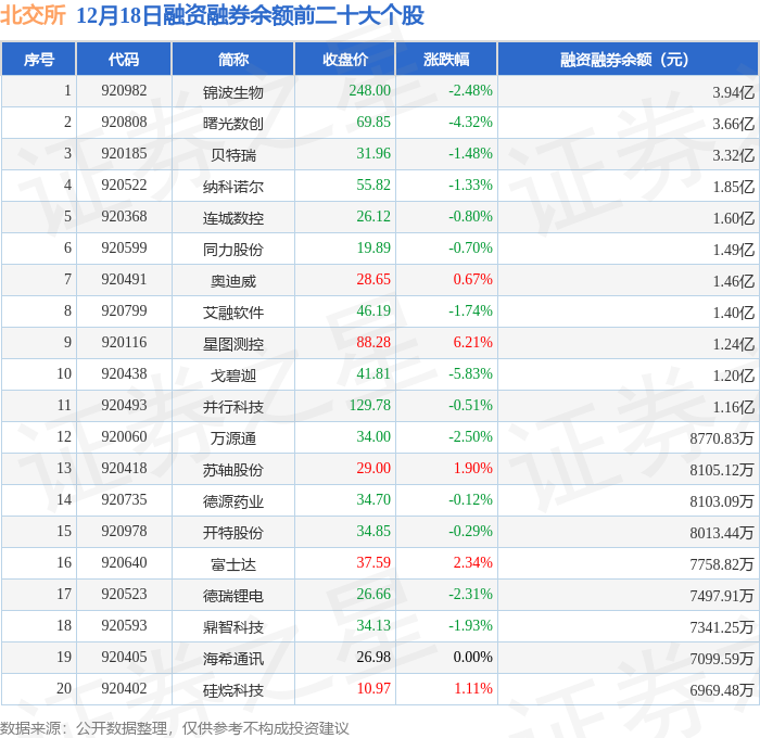 北交所融资融券余额前三分别为:锦波生物(920982)融资融券余额3.94亿元、曙光数创(920808)融资融券余额3.66亿元、贝特瑞(920185)融资融券余额3.32亿元,前20具体见下表: