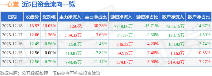 证券之星消息,截至2025年12月18日收盘,一心堂(002727)报收于13.93元,上涨10.03%,涨停,换手率9.23%,成交量36.66万手,成交额4.93亿元。