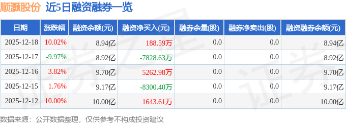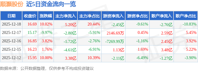 证券之星消息,截至2025年12月18日收盘,顺灏股份(002565)报收于16.69元,上涨10.02%,涨停,换手率14.7%,成交量155.81万手,成交额25.45亿元。
