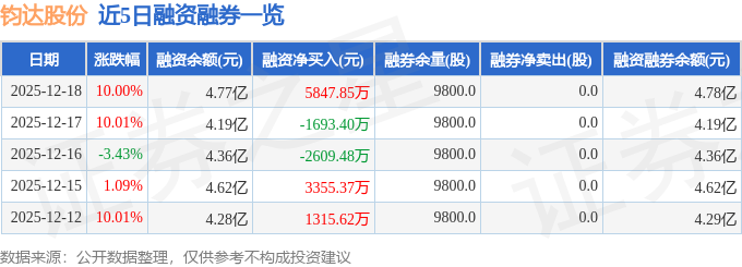 证券之星消息,截至2025年12月18日收盘,钧达股份(002865)报收于47.64元,上涨10.0%,已连续涨停2天,换手率16.1%,成交量36.2万手,成交额16.63亿元。