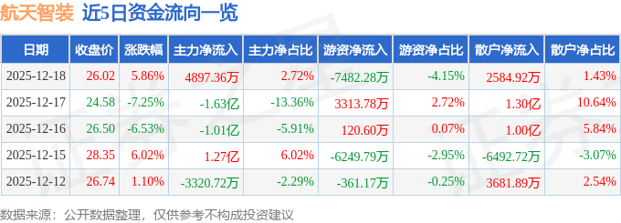 证券之星消息,截至2025年12月18日收盘,航天智装(300455)报收于26.02元,上涨5.86%,换手率9.77%,成交量69.2万手,成交额18.02亿元。