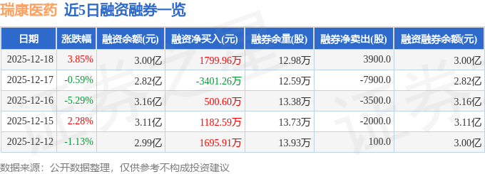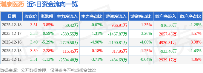 证券之星消息,截至2025年12月18日收盘,瑞康医药(002589)报收于3.51元,上涨3.85%,换手率14.95%,成交量204.22万手,成交额7.14亿元。