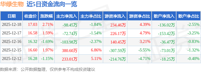 证券之星消息,截至2025年12月18日收盘,华绿生物(300970)报收于17.03元,上涨2.71%,换手率3.32%,成交量3.15万手,成交额5343.86万元。