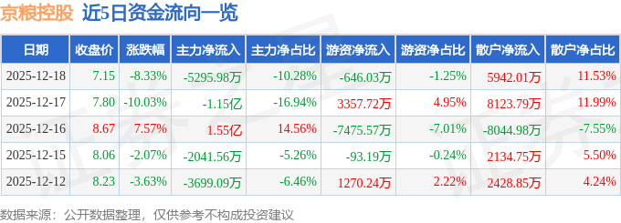 证券之星消息,截至2025年12月18日收盘,京粮控股(000505)报收于7.15元,下跌8.33%,换手率11.23%,成交量70.99万手,成交额5.15亿元。