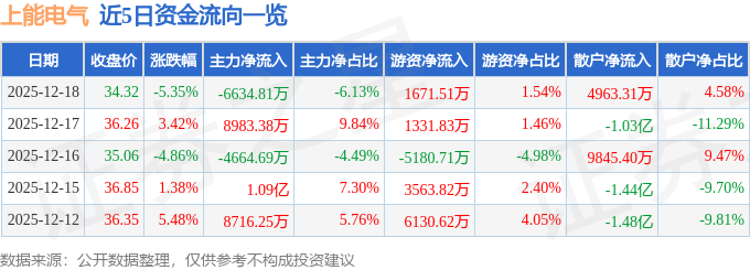 证券之星消息,截至2025年12月18日收盘,上能电气(300827)报收于34.32元,下跌5.35%,换手率8.09%,成交量31.16万手,成交额10.83亿元。
