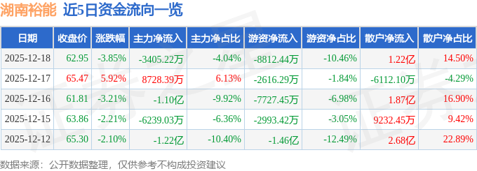 证券之星消息,截至2025年12月18日收盘,湖南裕能(301358)报收于62.95元,下跌3.85%,换手率3.42%,成交量13.2万手,成交额8.43亿元。