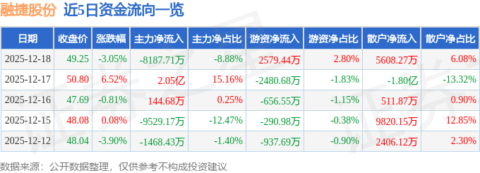 证券之星消息,截至2025年12月18日收盘,融捷股份(002192)报收于49.25元,下跌3.05%,换手率7.13%,成交量18.47万手,成交额9.22亿元。