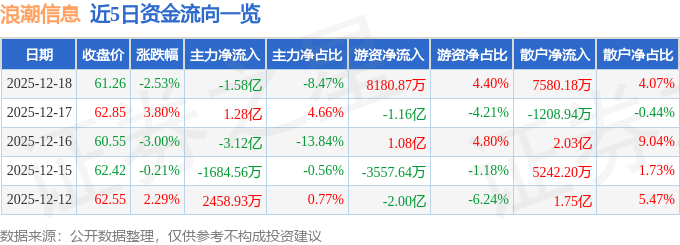 证券之星消息,截至2025年12月18日收盘,浪潮信息(000977)报收于61.26元,下跌2.53%,换手率2.05%,成交量30.06万手,成交额18.61亿元。