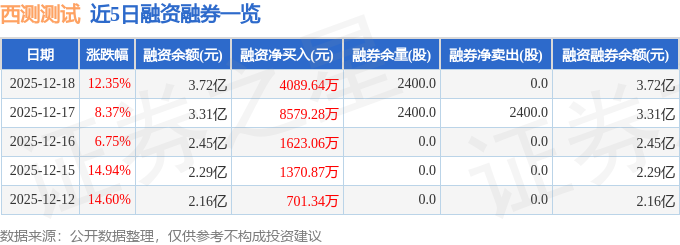 西测测试融资融券信息显示,融资方面,当日融资买入2.65亿元,融资偿还2.24亿元,融资净买入4089.64万元,连续3日净买入累计1.43亿元。融券方面,融券卖出0.0股,融券偿还0.0股,融券余量2400.0股,融券余额28.2万元。融资融券余额3.72亿元。