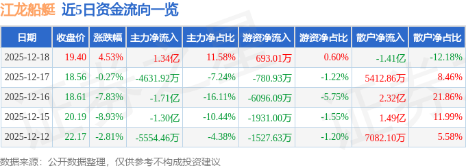 证券之星消息,截至2025年12月18日收盘,江龙船艇(300589)报收于19.4元,上涨4.53%,换手率26.25%,成交量60.8万手,成交额11.6亿元。