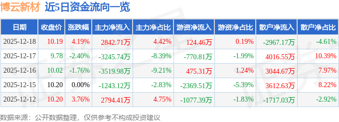 证券之星消息,截至2025年12月18日收盘,博云新材(002297)报收于10.19元,上涨4.19%,换手率10.99%,成交量62.99万手,成交额6.43亿元。