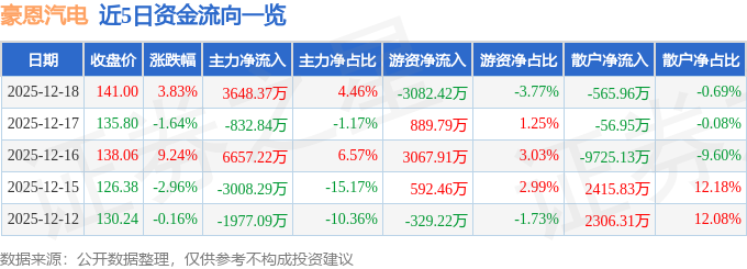 证券之星消息,截至2025年12月18日收盘,豪恩汽电(301488)报收于141.0元,上涨3.83%,换手率24.66%,成交量5.77万手,成交额8.19亿元。